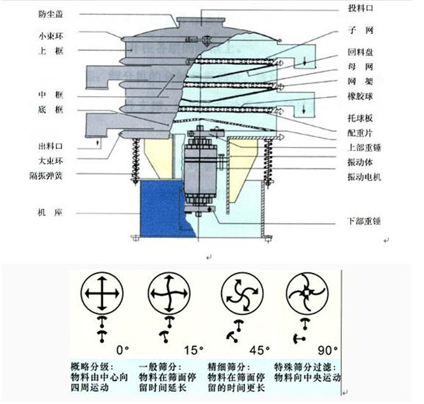 旋振篩是由直立式電機作激振源,電機上、下兩端安裝有偏心重錘,將電機的旋轉運動轉變為水平、垂直、傾斜的三次元運動,再把這個運動傳遞給篩面。通過調節上、下兩端的相位角,可以改變物料在篩面上的運動軌跡,通過增減振動電機上下兩端的偏心重錘配重塊重量可以增加和減少震動幅度。