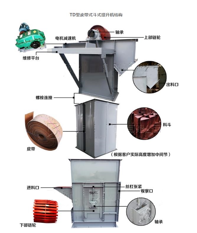 TD型斗式提升機由運行部分(料斗與牽引膠帶),帶有傳動滾筒的上部區段、帶有拉緊滾筒的下部區段、中間機殼、驅動裝置、逆止制動裝置等組成。適用于向上輸送松散密度ρ<1.5t/m3粉狀、粒狀和小塊狀的無磨琢性和半磨琢性散狀物料,如煤、砂、焦末、水泥、碎礦石等。另一種鋼絲繩芯膠帶斗式提升機,由于它的牽引構件為鋼絲繩芯膠帶所以比TD型的橡膠帶具有更好的耐磨抗拉效果。
