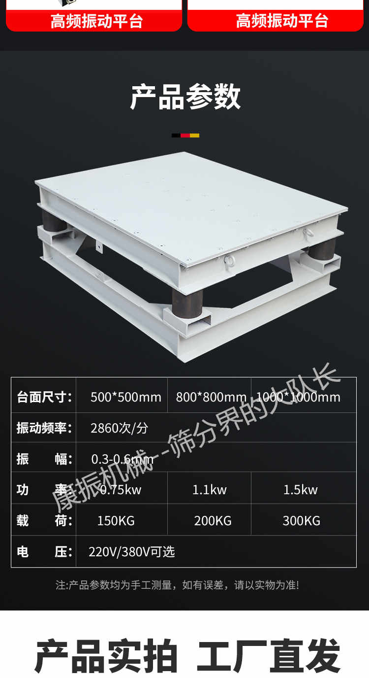 4、振動平臺分為上下振蕩、螺旋振蕩和三維振蕩三種振蕩方法。